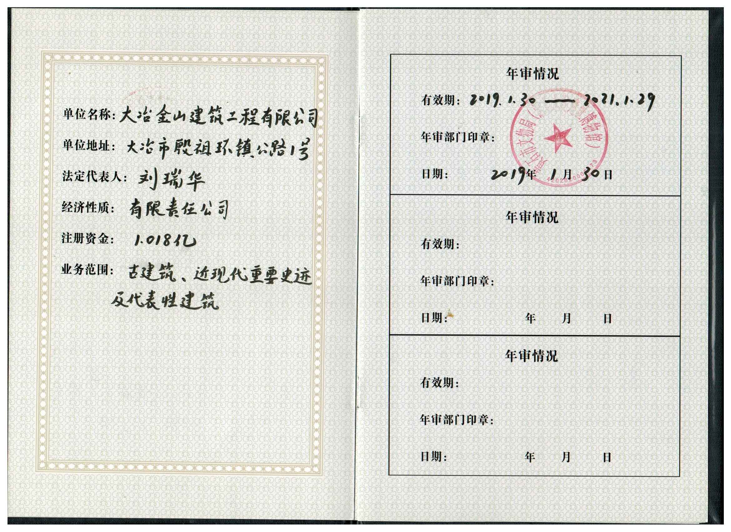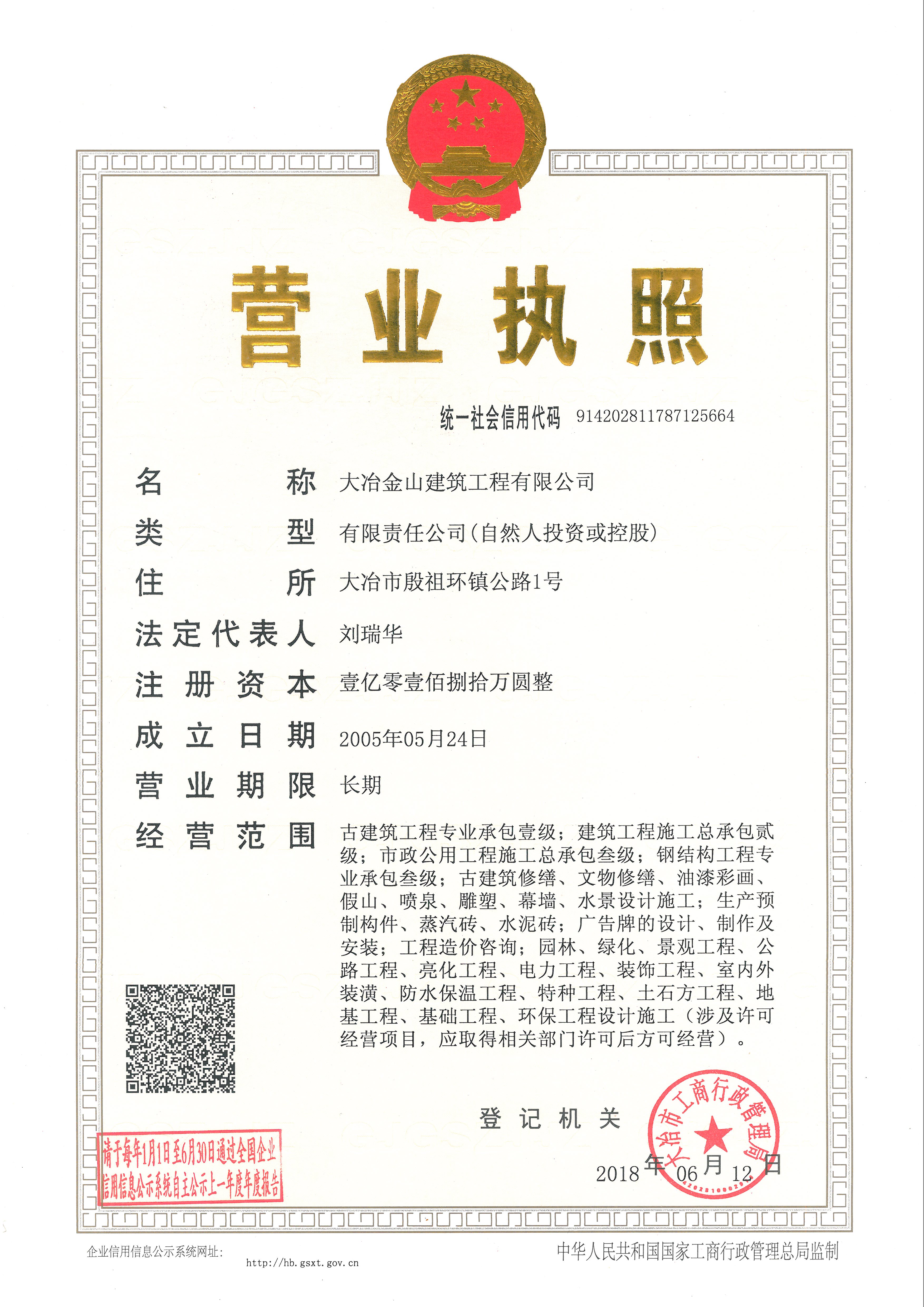 大冶金山建筑工程有限公司始建于1984年,屬鎮(zhèn)辦集體企業(yè)。1997年改制為大冶山建筑工程有限責任公司,屬股份制企業(yè)。2013年更名為大冶金山建筑工程有限公司,2018年3月公司資源重組,公司注冊資金達到10180.00萬元,公司法定代表人為劉瑞華。公司具有古建筑工程專業(yè)承包壹級、建筑工程施工總承包貳級、市政工程總承包叁級、鋼結(jié)構(gòu)工程專業(yè)承包叁級資質(zhì)。